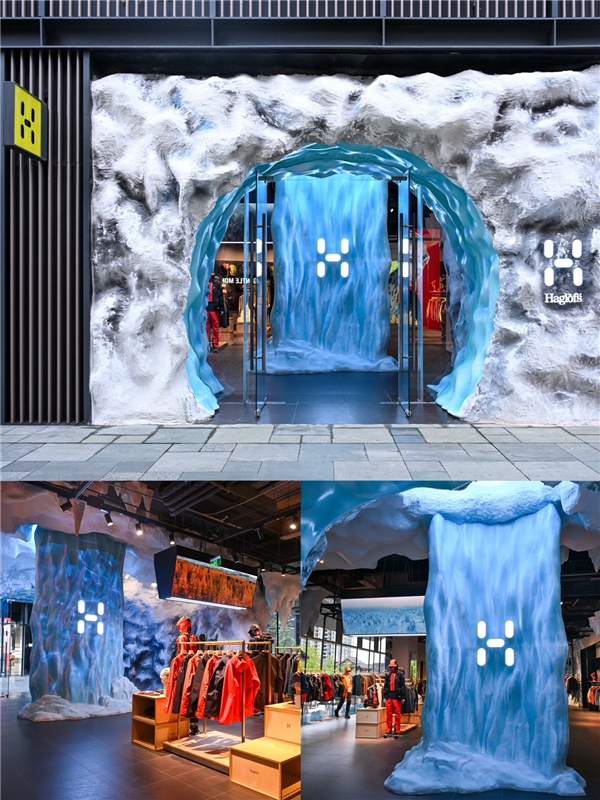 从踏入店铺的瞬间,独特的雪山山洞入口便引人入胜,仿佛下一秒就置身北欧的冰雪秘境;店内空间则以冰洞天坑为核心布局,抬头可见一道壮观的冰瀑从上方倾泻而下,营造出一种身临其境的震撼感。整个空间以冰川独有的冷冽与纯粹,让人感受到北欧冰雪环境的独特魅力,并悄然唤起对冰川保护迫切性的深层思考。