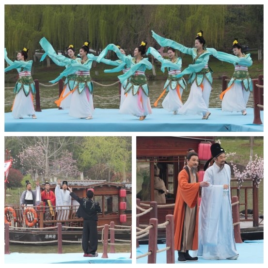 水域表演区,《踏歌舞》的舞者们踏歌而行,如从画中走来。一艘画舫载着萧统、屈原、陶渊明、李白、杜牧穿越而来。五贤重逢,隔空对谈。从陵阳清风到东流菊香,从秋浦诗魂到杏花烟雨。他们追忆往昔,更惊叹今朝:“千年过去,这座诗城非但文脉未断,反而更添生机!”。